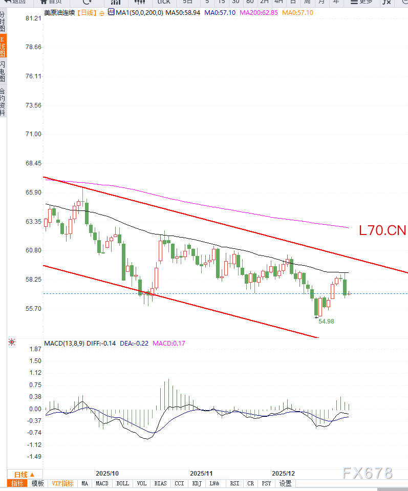 从美原油(WTI)日线图形来看,价格在前期快速下探后运行于低位震荡区间,目前仍受制于下行趋势压力。日线K线显示,WTI在56美元附近获得阶段性支撑,该位置接近前期低点区域,短线买盘开始介入,但反弹力度有限。