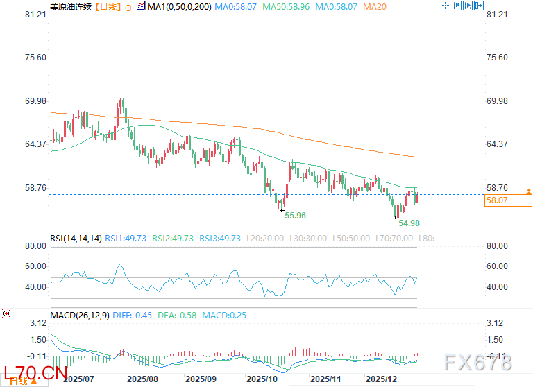 从技术层面看,轻质原油期货的中长期下跌趋势尚未扭转,但短期上涨动能已小幅抬头。其短期价格区间落在54.84美元至58.88美元之间,该区间的50%回撤位56.86美元,是近期的核心支撑点;而目前油价已收复另一关键50%回撤位57.60美元,这一进展进一步为反弹积聚了动能。