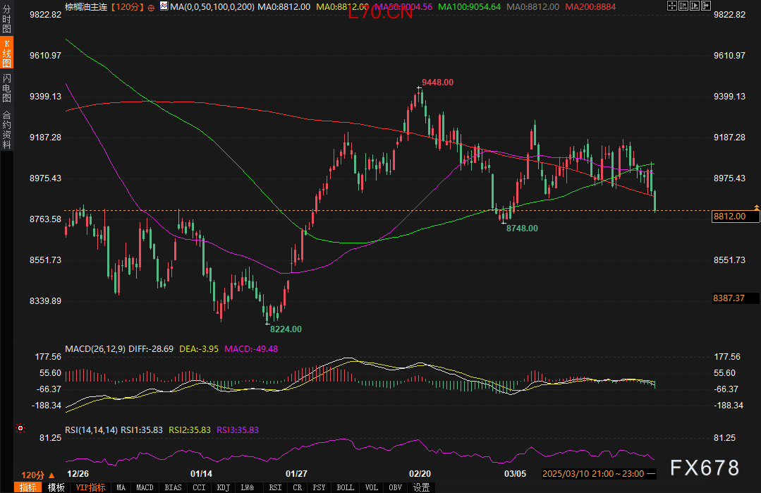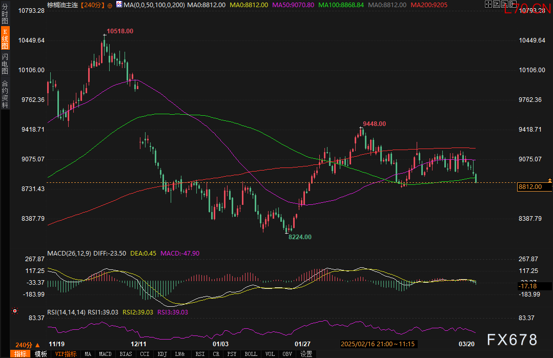汇通网3月25日讯—— 周二(3月25日),棕榈油期货市场延续弱势格局,马来西亚基准合约FCPOc3连续第三个交易日下跌,收于4247林吉特/吨,创近两个月新低。大连商品交易所棕榈油主力合约日内下跌2.07%港股配资开户服务网,收报8812元/吨,同步刷新阶段性低点。市场压力主要源于疲软的出口数据及竞争油品价格走弱,全球植物油市场的联动性进一步加剧空头氛围。