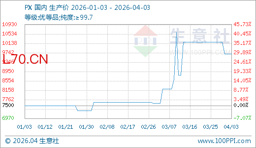 04月03日PX价格9700.00元/吨 30天上涨18.29%