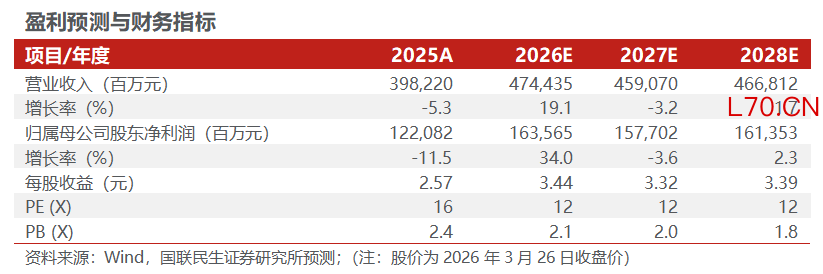公司储产空间高,成本管控能力和分红意愿强,油价中枢维持高位的背景下具备高股息特点,且随着国资委将上市公司价值实现和市值管理分别纳入到公司绩效评价体系和央企负责人考核中,央企被低估的估值有望实现理性回归。我们预计,公司2026~2028年归母净利润分别为1635.65/1577.02/1613.53亿元,EPS分别为3.44/3.32/3.39元/股,对应2026年3月26日的PE均为12倍,维持“推荐”评级。