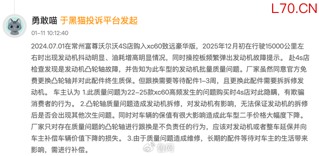 “才开2万公里的准新车,发动机故障灯反复亮,4S店说要拆发动机换凸轮轴,不仅没有任何补偿,还告诉我这是厂家最终方案!”北京车主陈先生(化名)提起自己的2025款沃尔沃XC60,满是无奈与气愤。