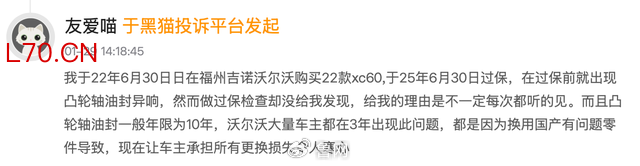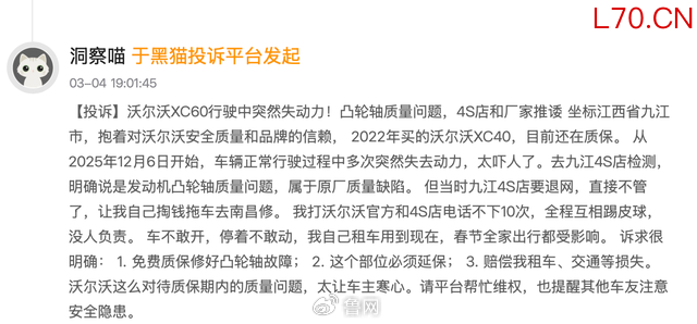 第三方投诉平台数据直观反映了问题的严重性。车质网显示,2025款沃尔沃XC60的125件质量投诉中,发动机电动机故障达88件,占比70.4%,凸轮轴故障是核心诉求点;沃尔沃相关车型投诉销量比从2023年的万分之23.9,攀升至2026年的万分之87.8,涨幅超2.67倍。