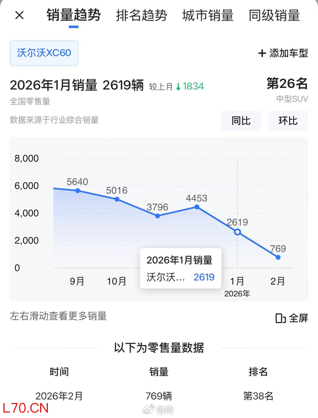 鲁网记者搜索数据发现,沃尔沃XC60全国零售量自2025年6月历史高点7179辆逐月下滑,2026年1月已降至2619辆,降幅达63.5%。瑞典本土市场也受影响,2026年1月沃尔沃XC60销量同比大跌54.8%。业内分析指出,“安全”是沃尔沃的核心品牌标签,而核心部件频发故障且处理敷衍,正在严重透支消费者信任。