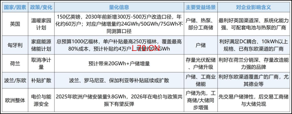 为对冲地缘政治带来的能源动荡,欧洲各国紧急出手,砸下重金布局储能产业:英国启动150亿英镑“温暖家园计划”,计划到2030年改造500万所住房,直接拉动千亿元户储市场;匈牙利推出总预算2.6亿欧元的家庭储能计划,补贴最高覆盖设备成本80%,聚焦10千瓦级储能设备;荷兰果断取消净计量政策,倒逼存量光伏用户增配储能,预计带来20吉瓦时的户储增量。