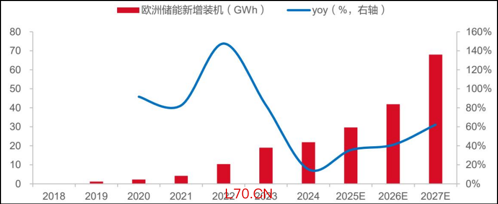 这种结构性变化,决定了四家龙头的受益路径与弹性差异——阳光电源聚焦大储,吃定长期确定性;德业、锦浪、固德威主攻户储与工商储,抢占短期高弹性;预期的终极则是:谁能实现从户储向大储、工商储的跨越,谁就能突破估值天花板。从上图欧洲储能新增装机趋势来看,2025-2027年将进入加速增长期,2027年装机量接近70GWh,这场行业盛宴才刚刚拉开序幕。