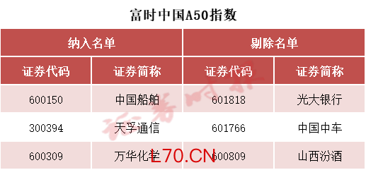 鉴于近期市场行情变化,富时罗素将富时中国A50指数成份股进行了调整,纳入中国船舶、天孚通信、万华化学,剔除光大银行、中国中车、山西汾酒。
