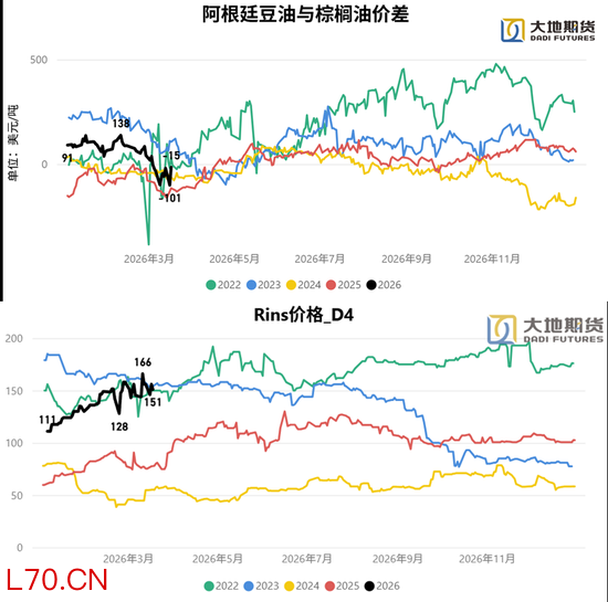据外部咨询机构信息,近期美国 D4 RIN 价格出现剧烈调整。D4理论价格两周内从1.45暴跌至1.01。理论价格与市场价格出现显著分歧D4市场价格仅从1.61跌至1.52。这一背离暗示D4 RIN 存在进一步下行压力,对美国生柴利润及豆油需求构成潜在利空。