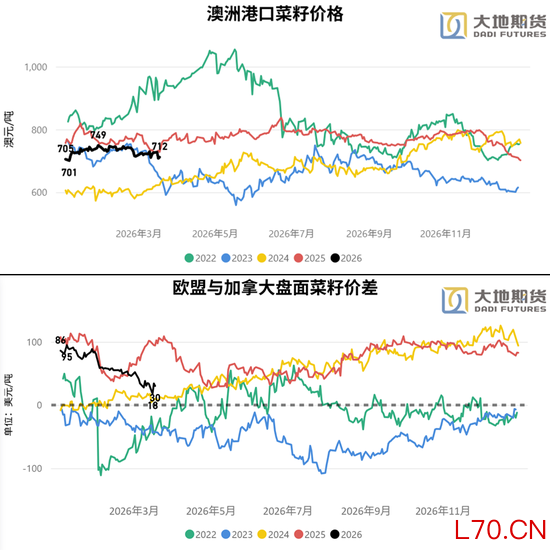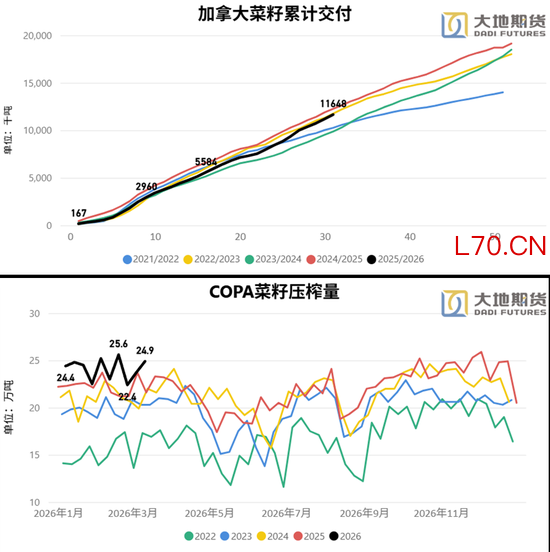 加菜籽价格受益于美豆油和原油的双重影响,但同样对应国际菜籽和国内菜油受此次战争的影响短期来看是油脂中相对最低的,和棕榈油类似在价格整体抬升后,加菜籽的基本面依旧维持弱势。产区的累计交付少了60多万吨,累计消费多了23万吨,在考虑新作增产,以及目前出口仍远落后进度的情况下,国际菜系供给过剩的叙事向国内传导是必然的。