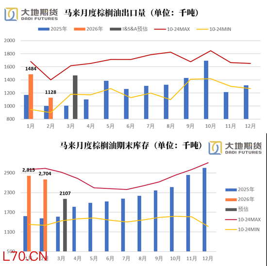 3月马来和印尼的出口出现了类似2月的替代与反替代的情况,出口显得异常的旺盛。且由于之前反复提到的斋月,以及开斋节的影响,马来3月的产量预估也兑现了刚才提到的减产预期。120万吨左右的产量预期,以及145万吨左右的出口预期,预计3月马来可能快速去库至210万吨,已十分接近往年同期的中性库存。