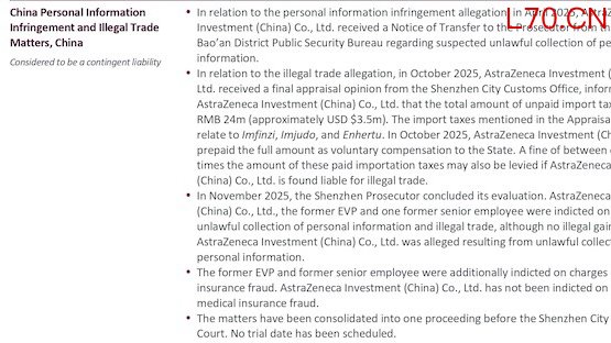 阿斯利康中国以及阿斯利康两位前高管,被深圳检方提起公诉